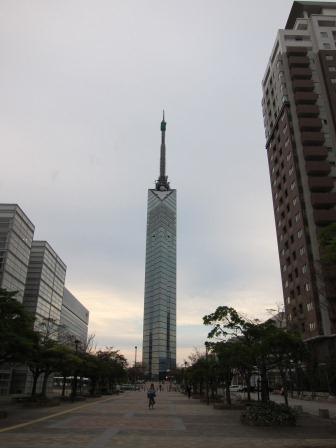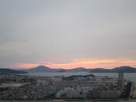 その後,近くにある福岡タワーにも行きました.地上123メートルの展望室からは,夕暮れ時の福岡市街と海が見えました.この日は,展望室付近は風速4メートルの風が吹いていましたが,建物の揺れは0.1センチメートルほどに抑えられていたようです.建物の揺れと逆方向に重心をずらす免震装置が働いているそうで,なんと風速63メートルの風まで耐えられるそうです.
