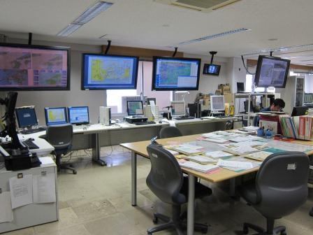その後,気象台の方のご厚意で内部を見学させてもらえることになりました.各地の気象データなどが大きなディスプレイに表示されており,何か新たな情報があるとそのたびに自動でアナウンスが流れていました.職員の方たちは,パソコンで作業したり,気象データ資料を見たり,打ち合わせをしたりと,慌ただしい雰囲気で,緊張した空気が伝わってきました.