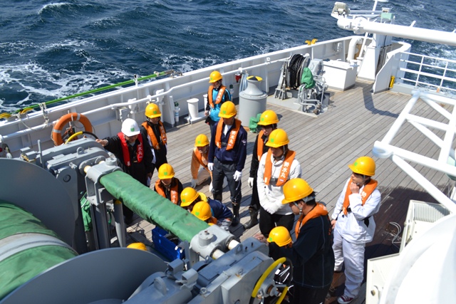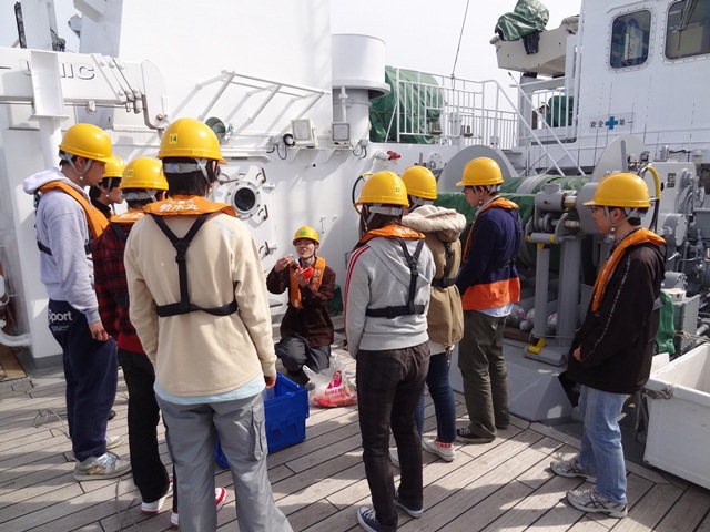 船に乗り込み、チーフオフィサーの船での注意のお話を聞いて、出港配備につきます(学生は船員さんの作業見学)。