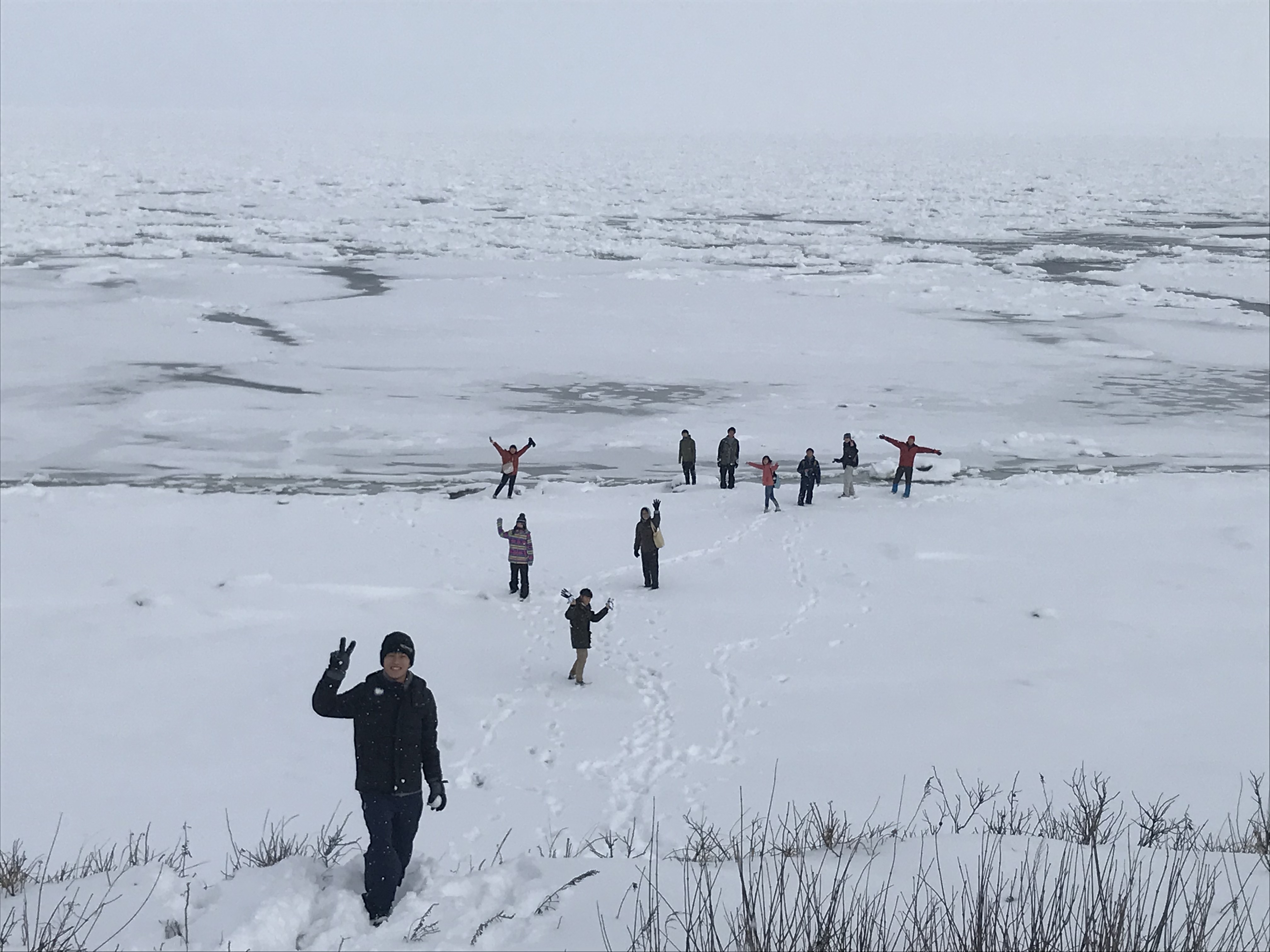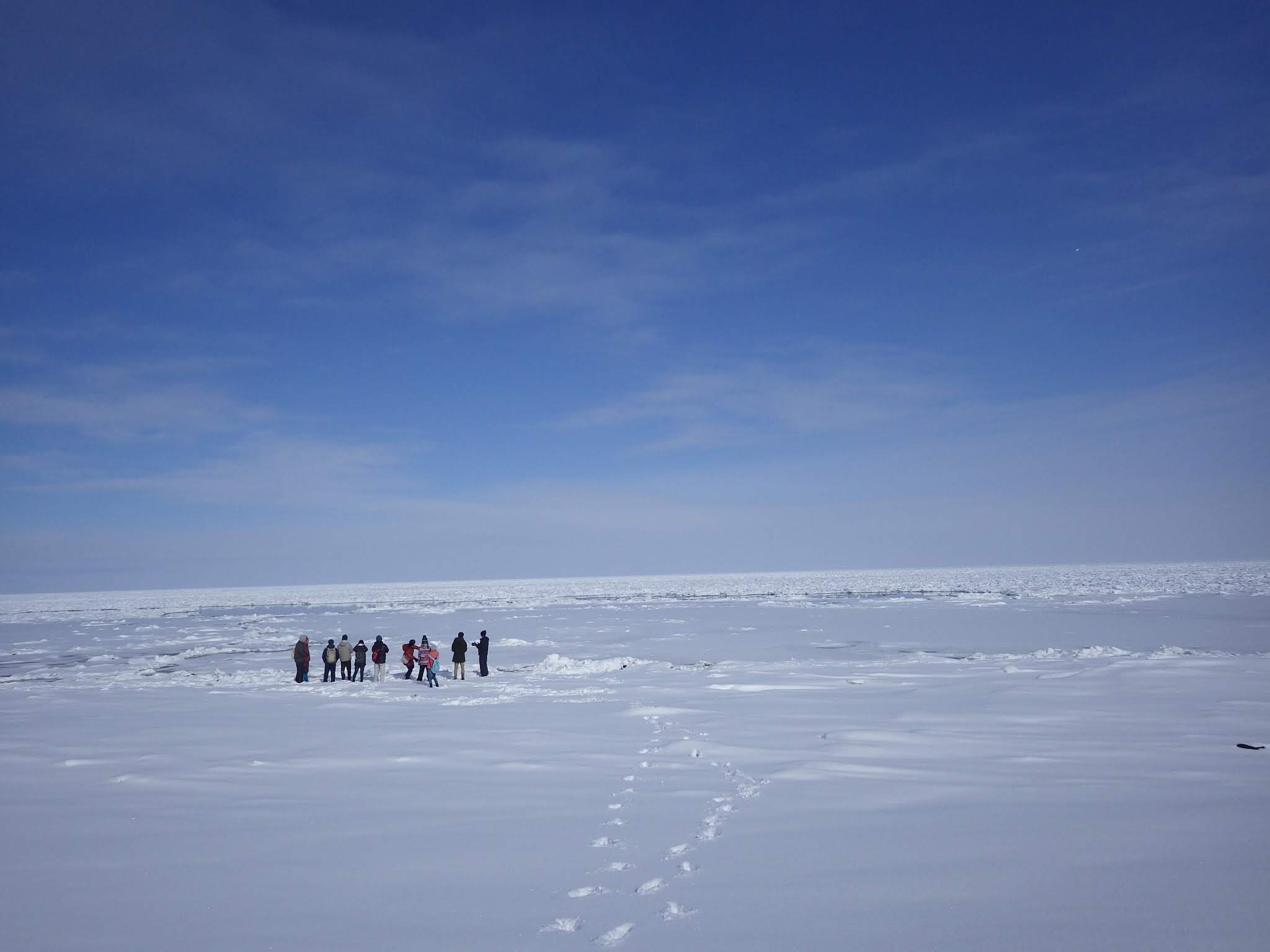 朝5:30から海岸へ出発。朝の静かな町を約10人でザクザクと向かいました。途中雪深い道なき道を抜けて海岸到着。初の流氷を拝んだ景色は脳裏にはっきり残っています。海岸へ来たはずなのに一面真っ白で。そこには本来海があるはずなのに。不思議です。こんなに大量の氷が、ロシアで、昔先輩が研究していたジュグジュルジェットで、作られてここまで流れてきたんか、と思うとすごいです。人の知らない氷の世界を垣間見ました。地球を感じました。流氷に近づいて触りに行くとシャーベットのようでした。先生曰く「全然張ってない、前はもっと沖まで歩けたよ」と。そんな流氷に出会いたい。と思うと同時に、将来もっと減ってしまうんかなと悲しい気持ちになりました。