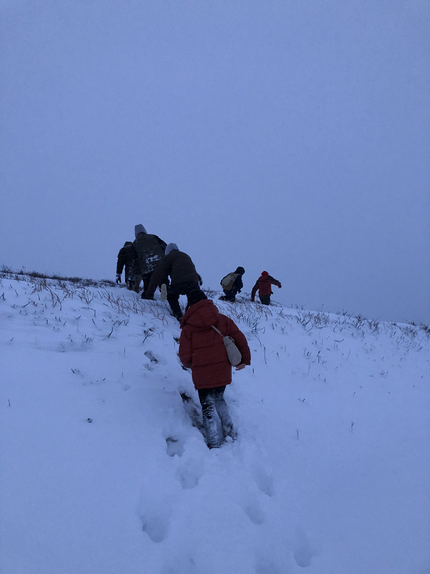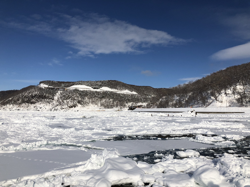 雪の冷たさに耐えながら必死に歩を進めていくと,とうとう流氷が見える位置まで到達しました.初めて見る流氷はとても美しく神秘的で,しばらくの間感激に浸りました.今年は暖冬ということで流氷の量も少なかったそうですが,十分に満足感を得ました.
