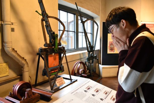 ケーブルカー博物館にて,ケーブルカーの動く仕組みが解説されてます.あくび?してませんよ.