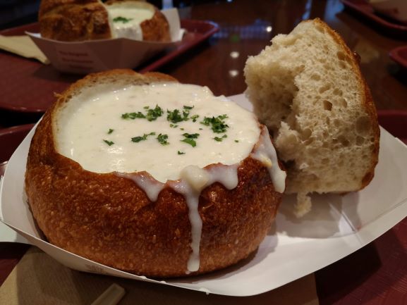 飯レビューその3:初めて食べるクラムチャウダーは絶品.酸っぱいパンがまたいいのです.