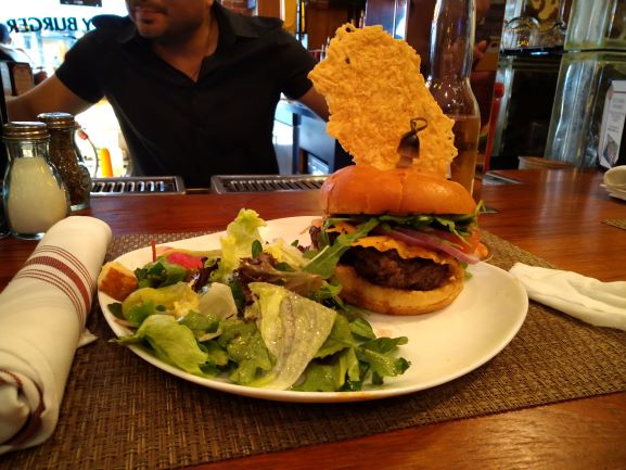 飯レビューその8:最後に食べたハンバーガーですが,一番おいしかった!カウンターのおじさんも気前がよくて好印象でしたね.