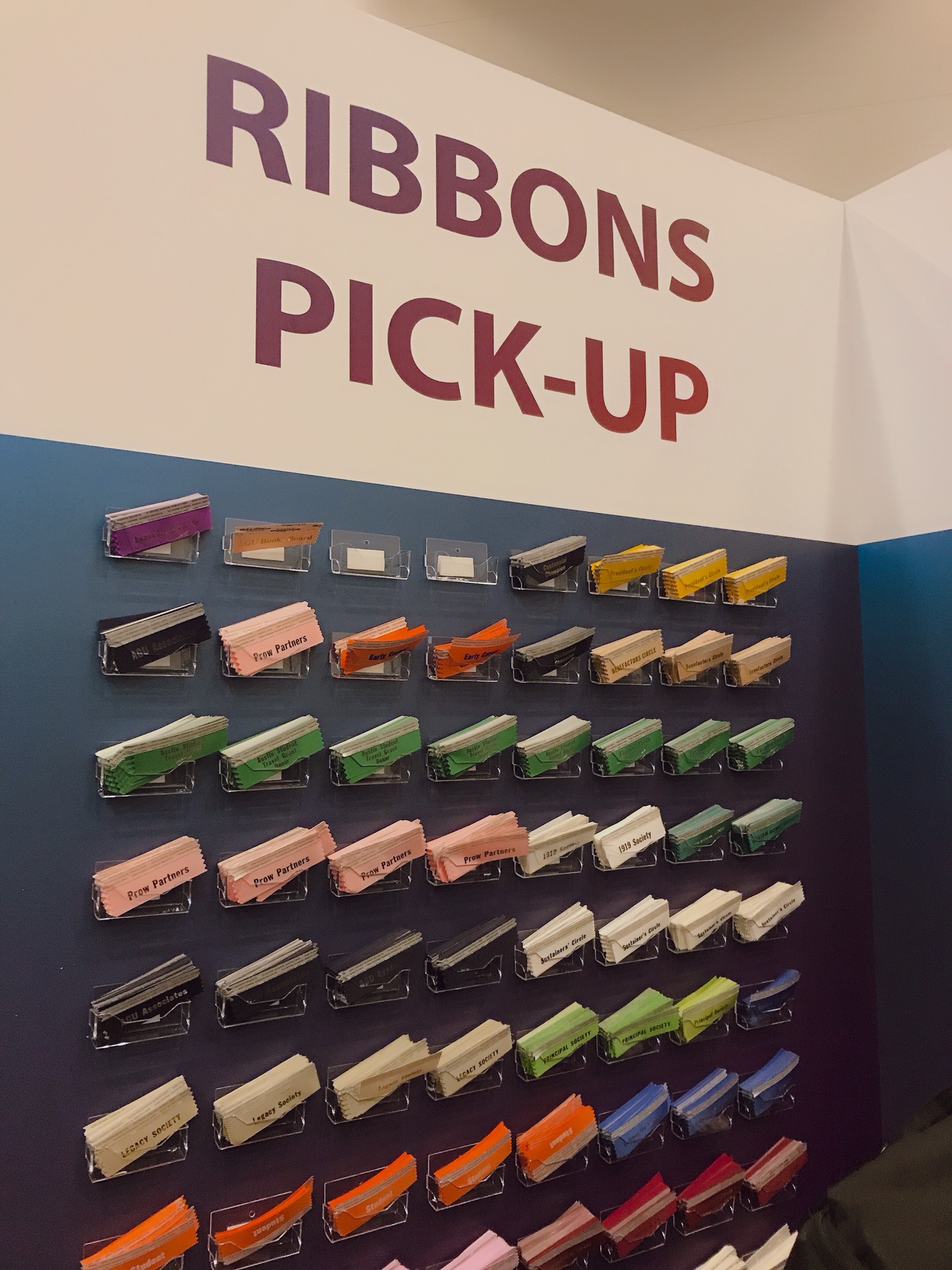 参加証兼名札にはオプションがいろいろとあって,ネックストラップやリボンの色で自分が何者かをアピールします.