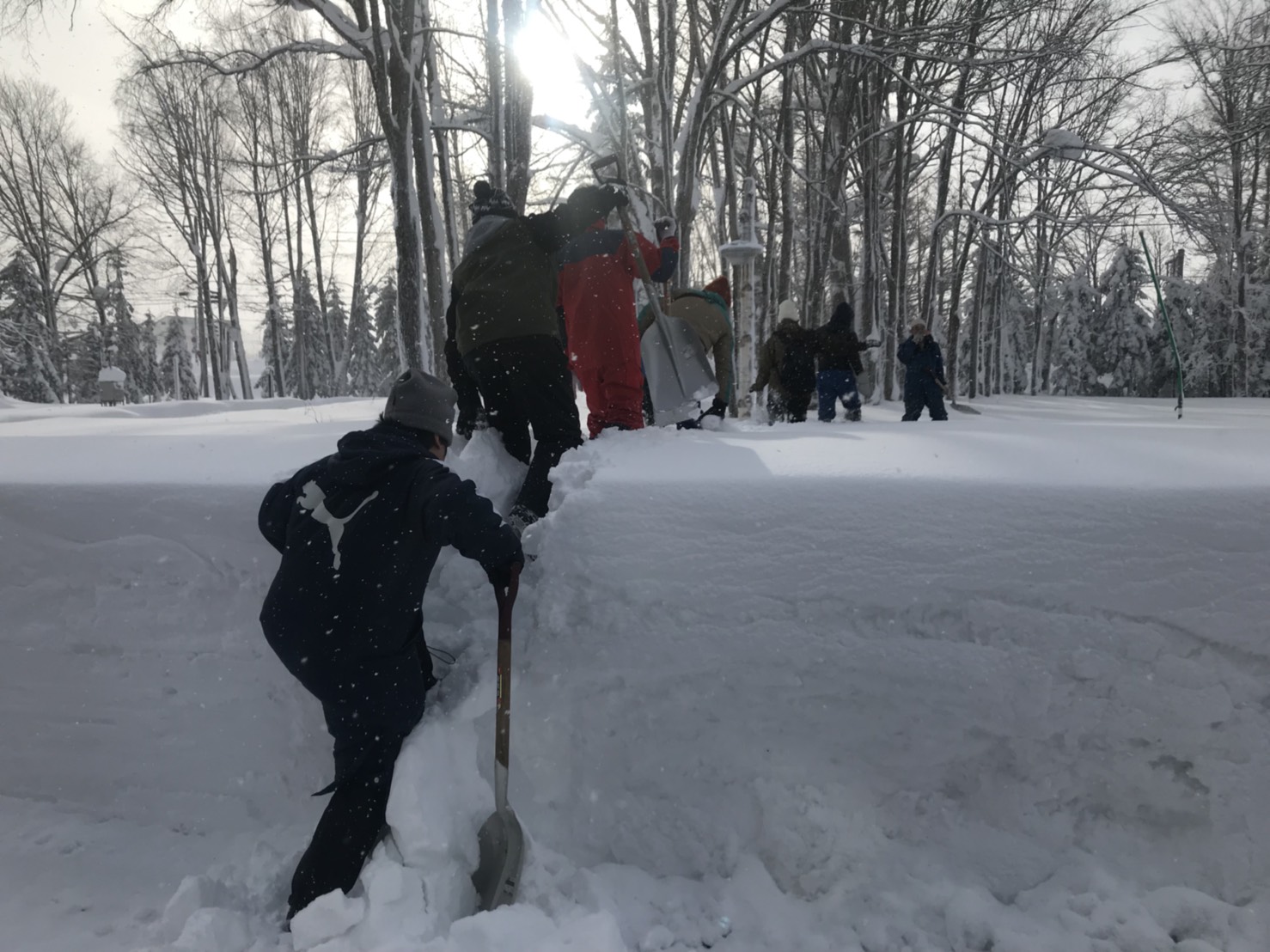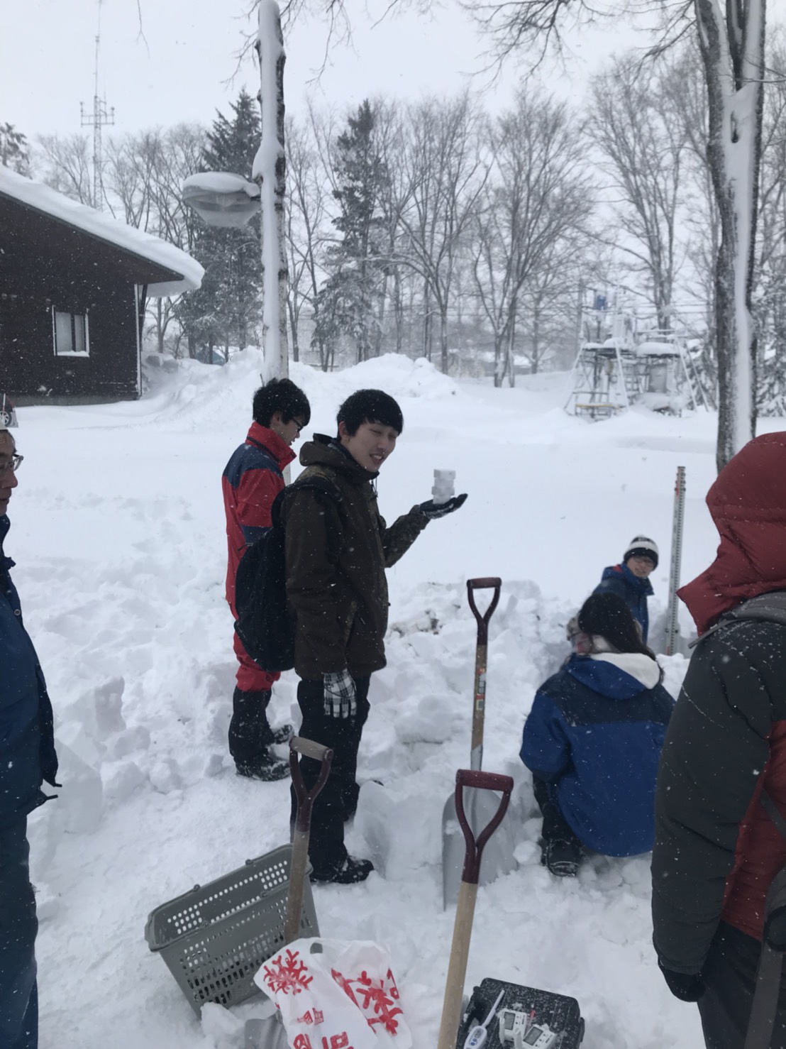 最初は観測のために、雪を掘りました。雪かきはしたことがあっても、雪を掘るということはなかったので、うまく掘れなかったのですが新鮮で楽しかったです。次に、観測方法を指導してもらってから、実際にものさしで積雪深、専用の道具を使って10cmごとの温度や密度も観測しました。雪の深さによって雪の温度や密度、質に段々と変化があっておもしろかったです。