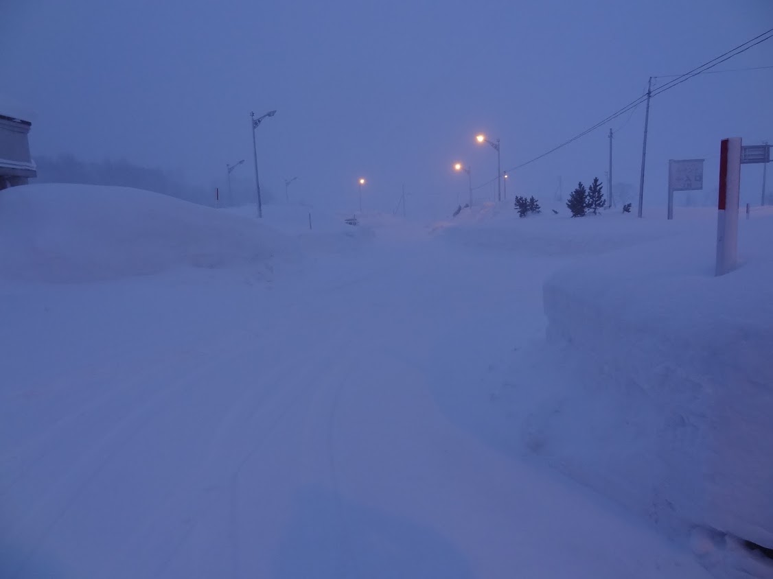 旭川から母子里までのレンタカーでの道のりは遭難すれすれ。この日はオホーツク海上に位置していた爆弾低気圧が猛威を奮っていたため猛吹雪でした。視界は完全にホワイトアウト。目的地に繋がる道も次々と通行止めとなり、そのたびに迂回経路を探しながら目的地を目指しました。当日目的地近くの名寄市の国道では100台もの車が立ち往生する事故もあったそうです。北の大地の気候の厳しさを大いに実感しました。