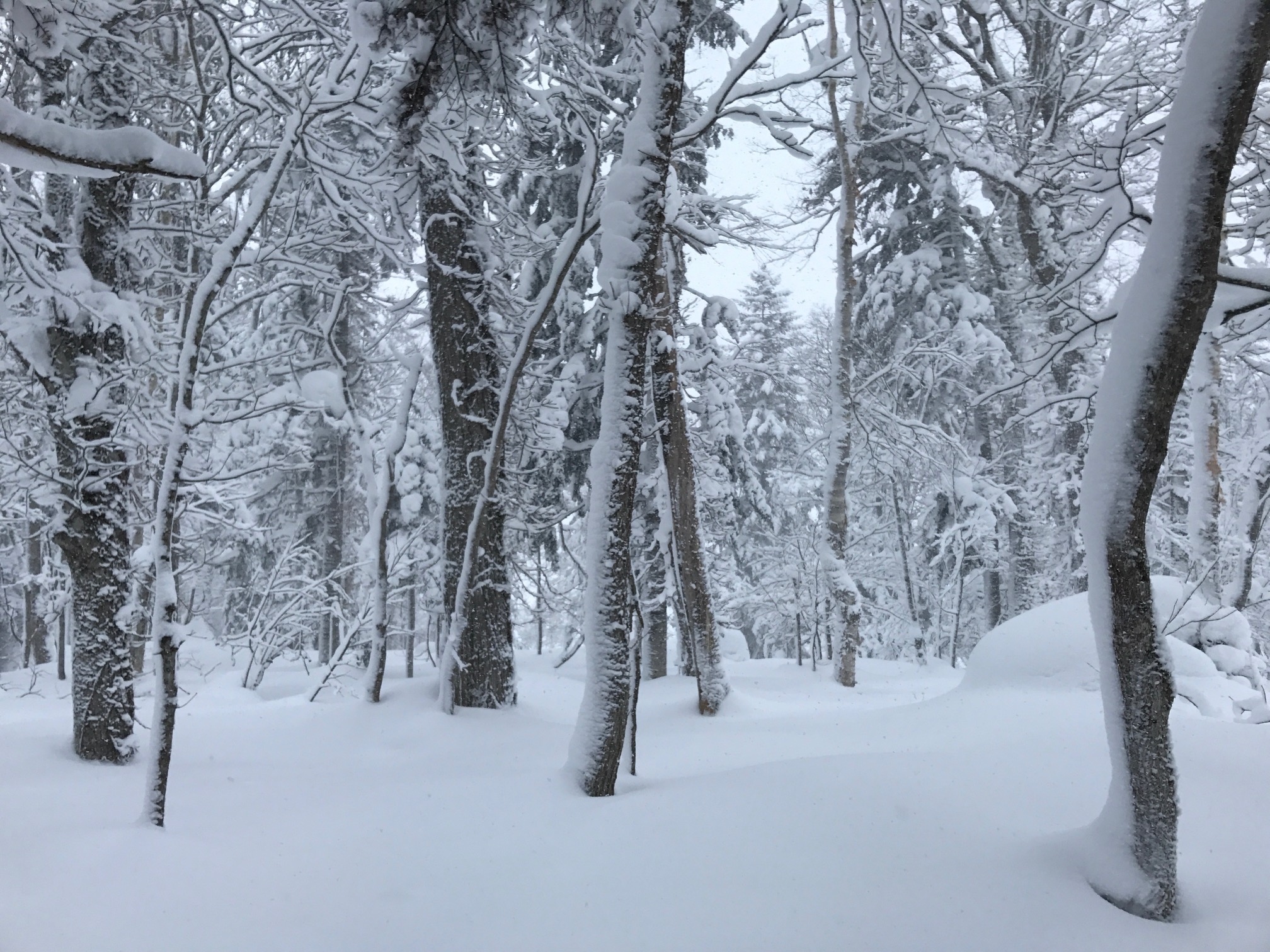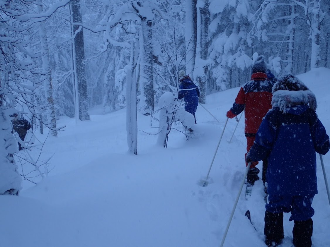 昼食を取って午後は近くの山で山スキー。レジャーで使うスキー板とは少し違い、板の裏にアザラシの皮が貼られていて斜面を登りやすくなっています。とはいえ、スキーなんてほとんど経験したことのない私たちはみんな盛大にズッコケていました(笑)研究林の先生から山の植生についての解説もいただき、とても思い出に残るスキー登山となりました。